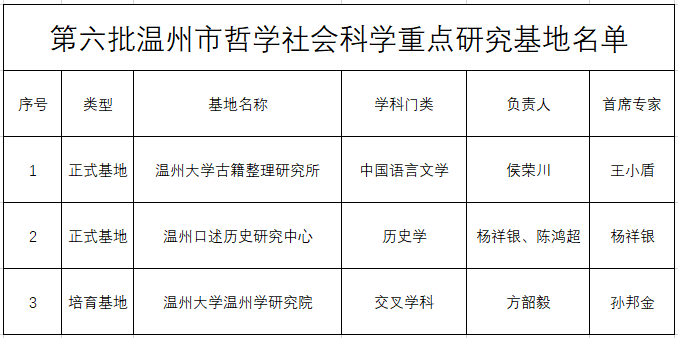 据悉,温州市哲学社会科学重点研究基地是我市社科研究的重要科研平台,承担着组织开展基础研究和应用基础研究、集聚培养优秀社科人才、开展高水平学术交流、推进社科成果转化应用、服务地方经济社会发展的重任。市哲社重点研究基地每两年评审一批,本次公布的是第六批,第六批共17家社科基地入选。