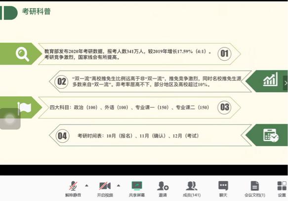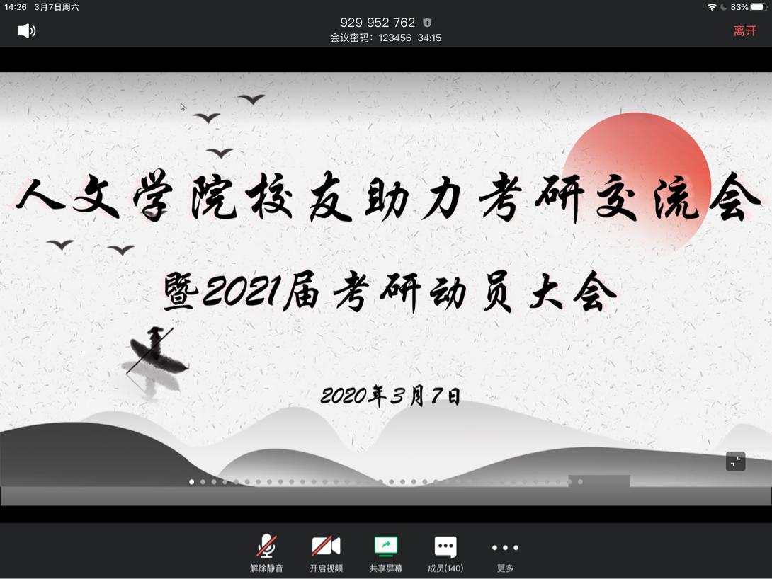 2020年3月7日14:00,德赢ac米兰官方合作vwin开展校友助力考研线上经验分享会暨2021届考研动员大会。本次分享会特意邀请来自南京大学、南京师范大学、安徽大学、上海师范大学、浙江师范大学等7位优秀校友,为我们带来丰富的考研经验和感悟。出席本次会议的有德赢ac米兰官方合作vwin党委副书记魏一老师、学工办主任刘纪峰老师、学工办申业磊老师、李丹萍老师以及有考研意向的同学共140余人。