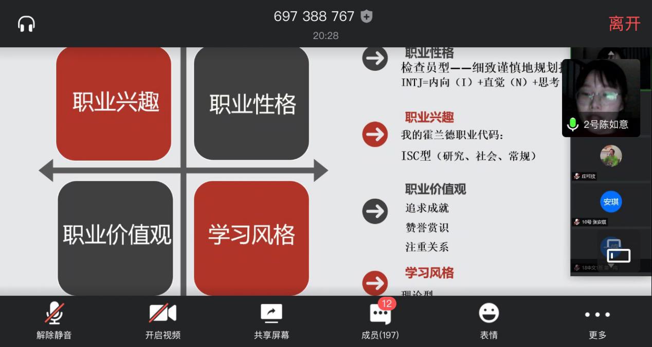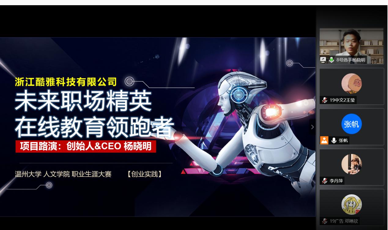 2020年5月15日18:30,德赢官网在腾讯会议上举行了第六届职业生涯规划大赛决赛。东方学院就业指导教研室主任叶加德老师、浙江工贸职业技术学院就业教师高富春老师、温大招生与就业处生涯教育科科长洪艳老师、温大招生与就业处就业指导教研室主任朱丽莉老师和院学工办主任刘纪峰老师作为评委到场。