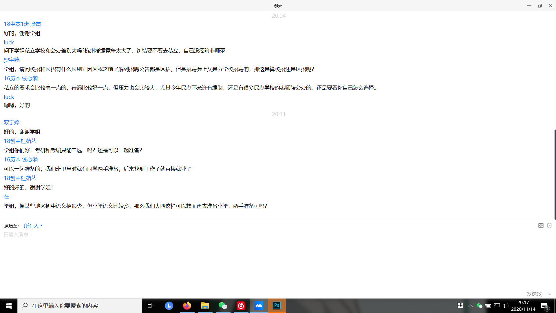 2020年11月14日晚6点30分,德赢官网“2020年下半年就业服务系列活动之校友考编云分享”在腾讯会议上正式拉开帷幕。参与此次分享会的有院学工办辅导员李丹萍老师,4位优秀校友以及有考编意向的80余位同学