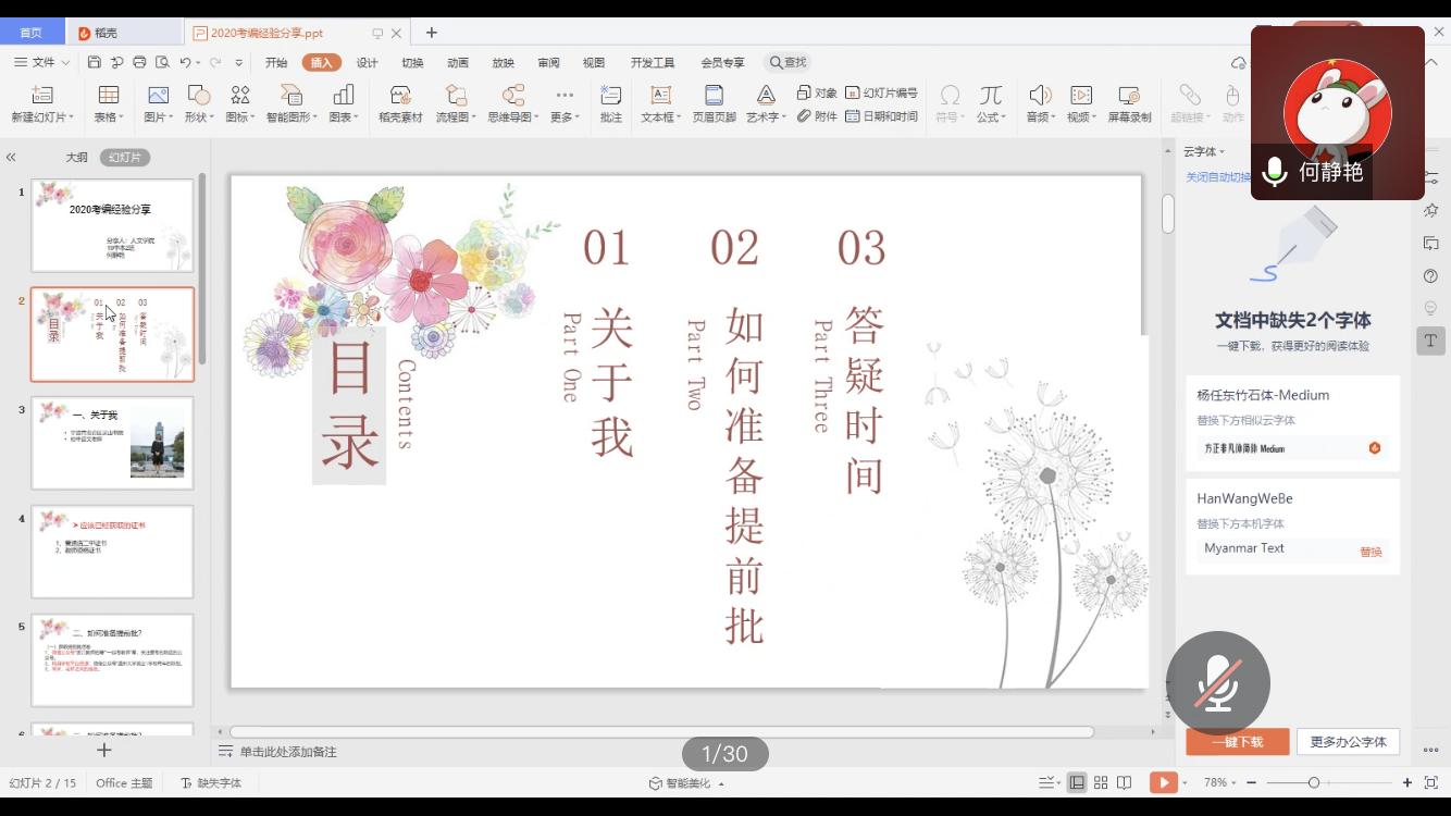 分享会上,李丹萍老师首先说明举办考编云分享的初衷,希望大家能有所收获,并感谢4位优秀校友百忙之中抽出时间来分享经验。随后进入校友分享环节。毕业于16中1班的王佳颖学姐向大家提出了几点宝贵建议一是重视专业发展二是提升教师技能三是珍惜每一次机会,做好相关准备四是合理规划时间,学会取舍。16中文2班的何静艳学姐主要分享了如何准备提前批,包括获取提前批信息、提前批的要求、需准备的材料、面试准备的一些细节等16历史(师范)的钱心漪学姐主要围绕关注招考信息、面试流程解读、备考经验分享三方面展开经验分享。她强调要明确自己就业方向,向大家分享了板书设计、教案速写的要点以及结构化面试模拟上课的技巧毕业于16历史(师范)的倪羽筝学姐 ,以“纯熟的师范技能助你一路升级打怪”为主题进行经验分享,介绍了提前批面试的基本流程,同时向同学们推荐了一些参考教辅用书和教学网站。她建议大家大学期间要重视学习;在面试时,要注重仪容仪表并保持平和的心态。