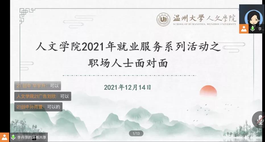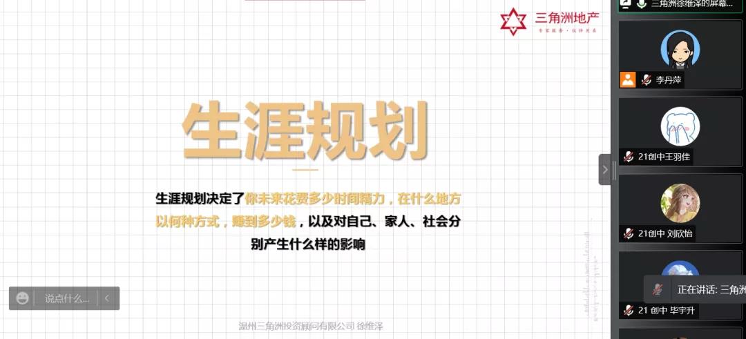 为明确同学们的职业规划方向和职业发展成长路径,2021年12月14日下午,德赢官网邀请温州三角洲投资顾问有限公司人力资源经理徐维泽和策划经理张舒乐,在腾讯会议上为大家分享职业规划和职场上的那些事儿。