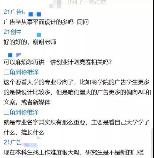 分享接近尾声,同学们针对专业、职业等方面提出自己的疑问,进行了线上答疑和探讨。经过本次分享,同学们更清晰地认识到了职业生涯规划的重要性。提前做好个人职业生涯规划,制定前进目标,方能君志所向,一往如前。