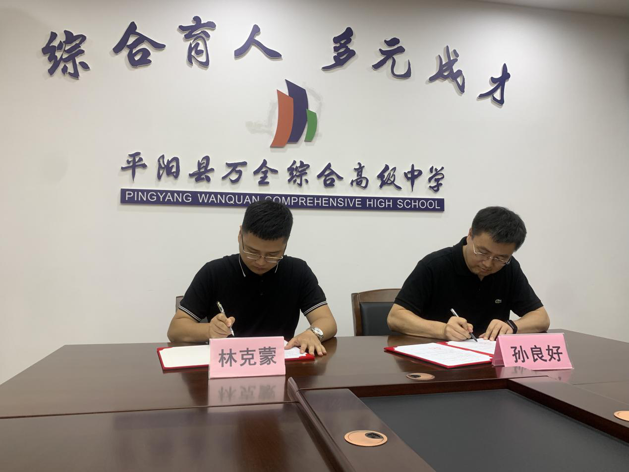 温州万全教育集团董事长陈孝杰与平阳万全综合高级中学校长林克蒙一行热情接待,并带领杨林书书记一行参观了学校。座谈会上,陈孝杰董事长介绍了集团整体发展概况,林克蒙校长围绕平阳万全综合高级中学办学历史、育人理念、教师成长等方面展开交流。杨林书书记说明了本次来访的目的与意义,期望通过校企合作,实现资源共享。孙良好院长介绍了学院基本情况,包括在校学生概况、师资力量、专业特色等。双方就如何深化合作进行探讨,表示接下来将积极开展多层次、多形式的合作。座谈交流后,双方签订了共建就业实习基地协议,举行了实习基地授牌仪式,正式在平阳万全综合高级中学建设“德赢ac米兰官方合作vwin就业实习基地”。