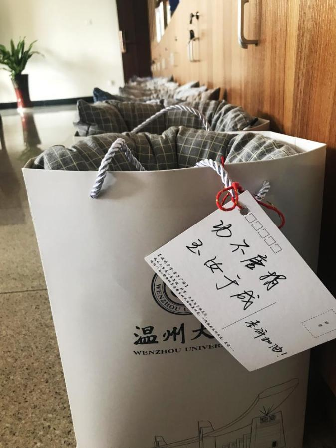 座谈会上,院党委书记江秀景和院党委副书记魏一分别为两位考研学生代表发放考研大礼包,内含坐垫、保温杯和计时器等物品,袋子上悬挂着学妹们手写的美好寄语,承载着学院对于考研同学的真挚祝福与真切期望。
