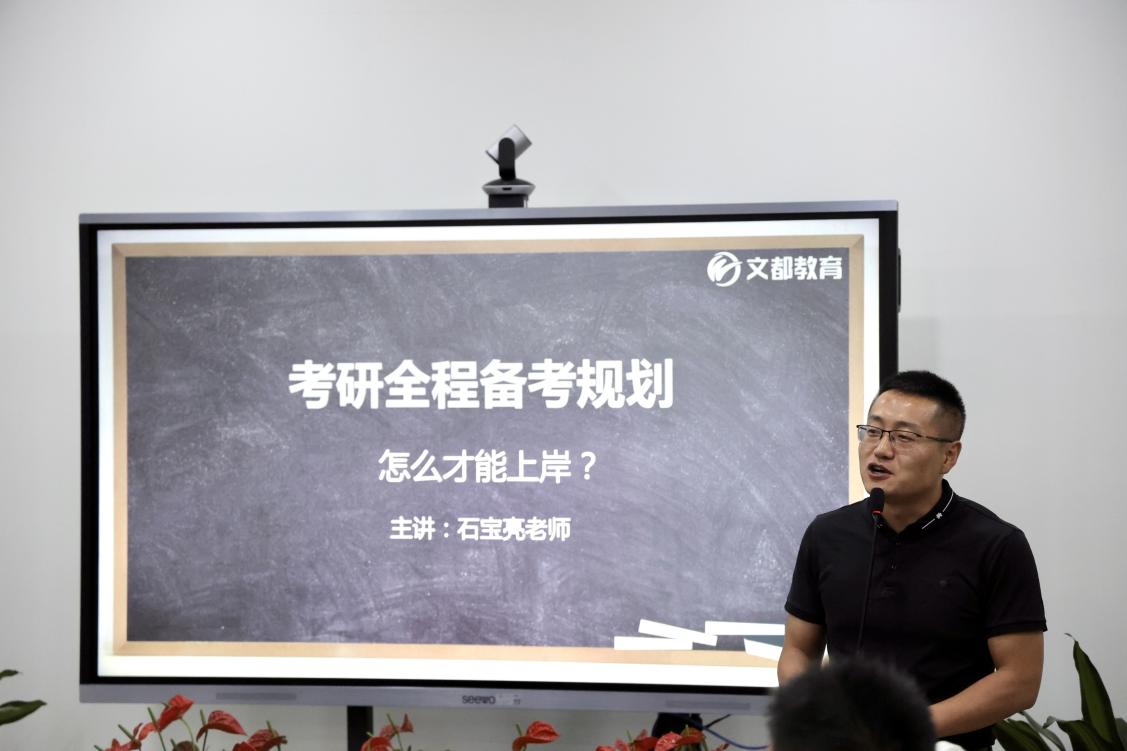 讲座伊始,文都教育石宝亮老师结合近10年考研报考录取人数比对数据,为我们简要分析了当下考研形势。他提到,随着近年来高校应届毕业生人数不断上升,考研正日益成为广大学子的重要选择之一。他以高考为对比对象,从择优录取、志愿唯一、先报后考、初试复试、单科总分、调剂自主六方面为同学们细致讲解了考研的独有特点和具体流程。在专业院校的选择方面,他强调,同学们应当根据自身优劣势并结合未来职业方向按照区域性质、分数区间、院校人数等五步骤精准匹配相应院校,避免出现选择失误。石老师以备考计划的制定为着眼点,从目标分数的确立及分解出发,对夯实基础、暑期强化、报前模考、专题突破、考前冲刺五阶段的核心目标逐一作出阐述,为同学们指明了一条科学的复习路径。