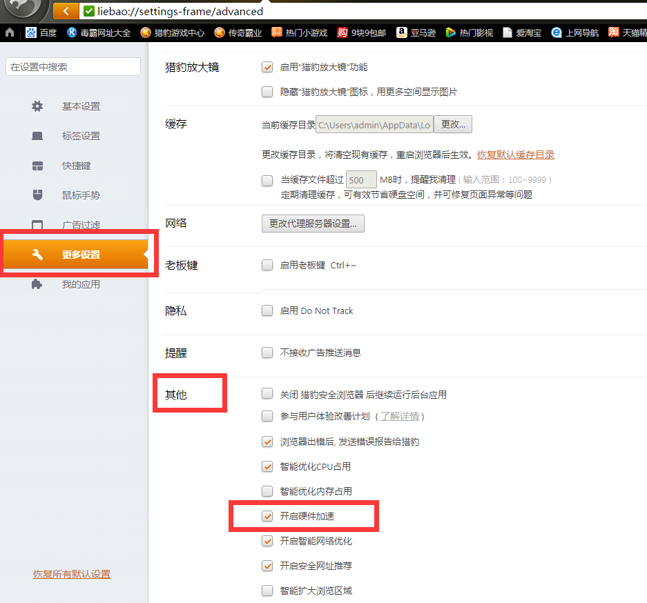 选择【更多设置】,找到【其他】,点击【开启硬件加速】。