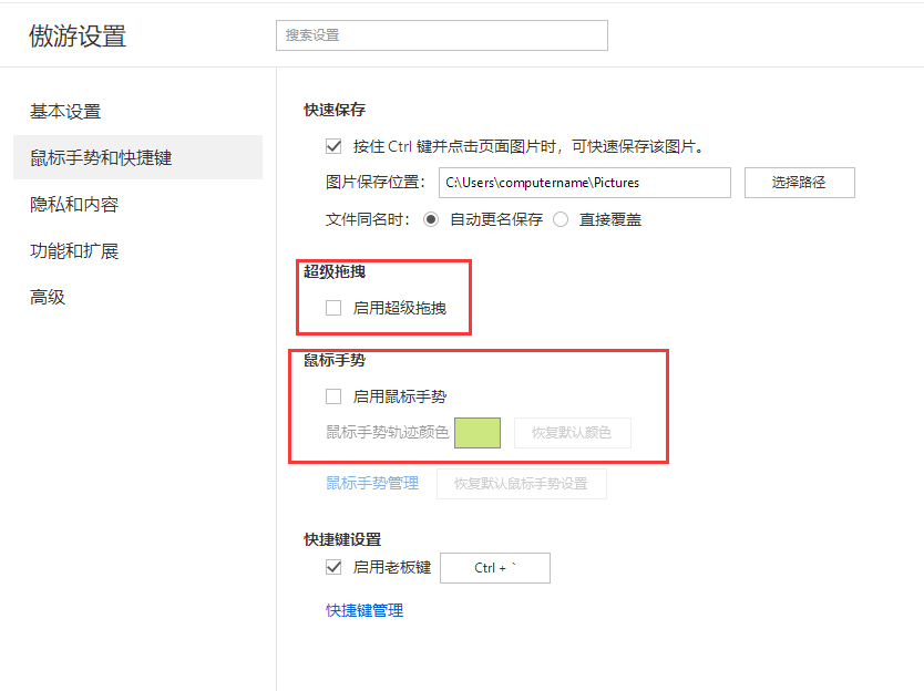 选择【鼠标手势和快捷键】,把【启用鼠标手势】和【启用超级拖拽】前面的对勾去掉,关闭鼠标手势