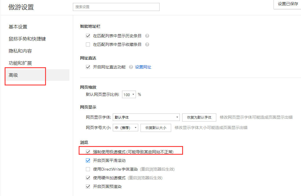 选择【高级】,在浏览中选择【强制使用极速模式(可能导致某些网站不正常)】