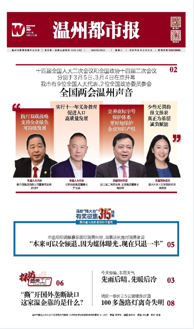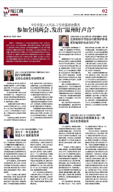 温都讯 十四届全国人大二次会议和全国政协十四届二次会议分别于3月5日、3月4日在京开幕。温州市委书记张振丰,中国工程院院士、温州医科大学校长李校堃,亿联控股集团董事长严立淼,德力西集团有限公司董事局主席胡成中,洞头先锋女子民兵连连长陈盈盈,平阳县鳌江镇食用笋种植户陈爱珠,浙江胜华波电器股份有限公司车间主任李安锐,浙江晨泰科技股份有限公司高级模具设计师胡东方,永嘉县岩坦镇源头村党总支书记、村委会主任陈小静等9位全国人大代表以及正泰集团董事长南存辉,德赢ac米兰官方合作vwin研究员蒋胜男等2位全国政协委员代表我市参加全国两会,带去“温州好声音”。