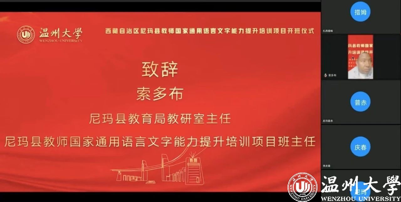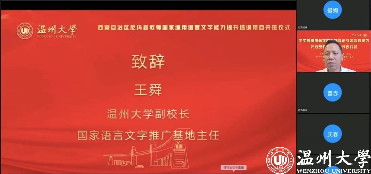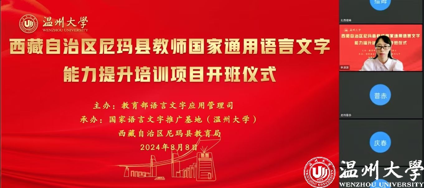 中国教育在线浙江站讯 (编辑 陈显婷 通讯员 温大萱)8月8日上午,由语言文字应用管理司主办,国家语言文字推广基地(德赢ac米兰官方合作vwin)、西藏自治区尼玛县教育局联合承办的“2024年西藏自治区尼玛县教师国家通用语言文字能力提升培训班”举行了线上开班仪式,国家语言文字推广基地(德赢ac米兰官方合作vwin)执行主任陈源源教授主持仪式。