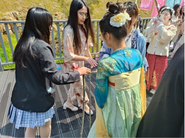 活动伊始,樱花园内衣袂翩跹,数十名青年志愿者身着曲裾深衣、齐胸襦裙等传统汉服,以“行走的历史画卷”之姿开启文化盛宴。广袖流云间,古韵与新风交织,青年学子化身传统文化使者,带领观众穿梭千年时空,在沉浸式体验中触摸华夏衣冠文明的璀璨光华。“趣味答题”以文会友,从汉服“交领右衽”的形制智慧到“十二章纹”的礼制深意,参与者透过趣味互动解码服饰中的文明密码;“投壶竞技”再现周礼雅趣,箭矢破空声中诠释“发而不中,反求诸己”的君子之风;“不倒森林”协作挑战则以现代游戏激活古籍《礼记》中“和而不同”的哲学智慧。活动现场欢声笑语不断,传统文化不再是书本上的抽象符号,而是化作可触可感的鲜活体验,青年一代在团队协作与文化解码中,悄然完成对“何以中国”的精神叩问。