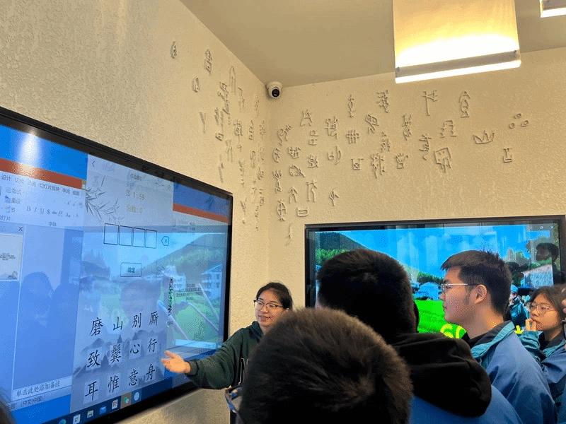 一踏进国家语言文字推广基地,就能看到墙上铺满的甲骨文,恰如其分地道出了中国文字的独特韵味。“大家抬头看看上面的甲骨文字体,选择一个自己喜欢的,不用担心认不出它,我们能在后面找到属于它的答案。”随着讲解员的解说,船寮中学的同学们仿佛进入了一幅刻满中国文字变迁的动态画卷,一步一步地了解中国文字艺术的情趣。