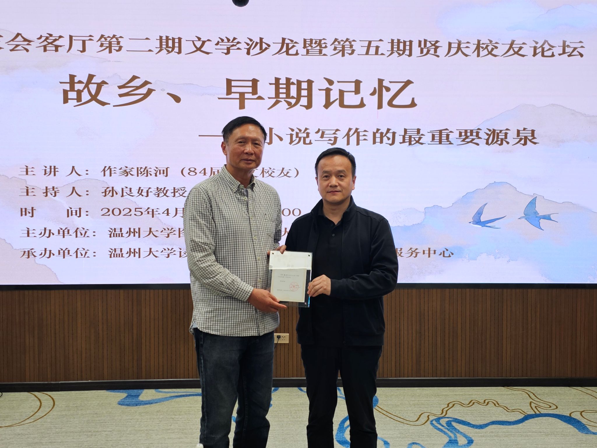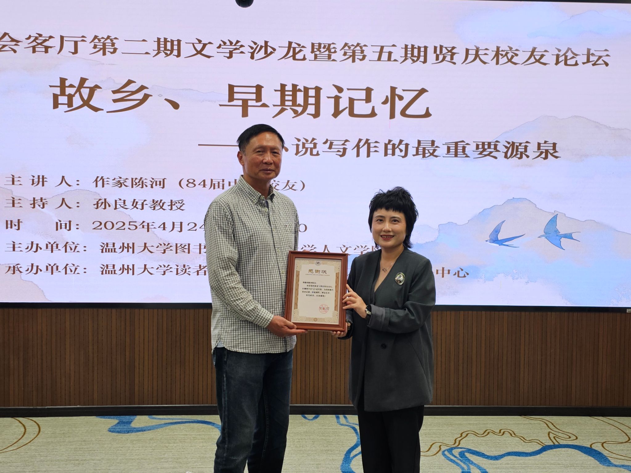 活动尾声,德赢ac米兰官方合作vwin图书馆副馆长周志峰为陈河颁发“温籍作家会客厅”常驻作家聘书,德赢ac米兰官方合作vwin党委副书记黄玮向其赠送“贤庆校友论坛”感谢状。陈河表示,未来将加强与母校的文学互动,助力青年学子探索创作之路。