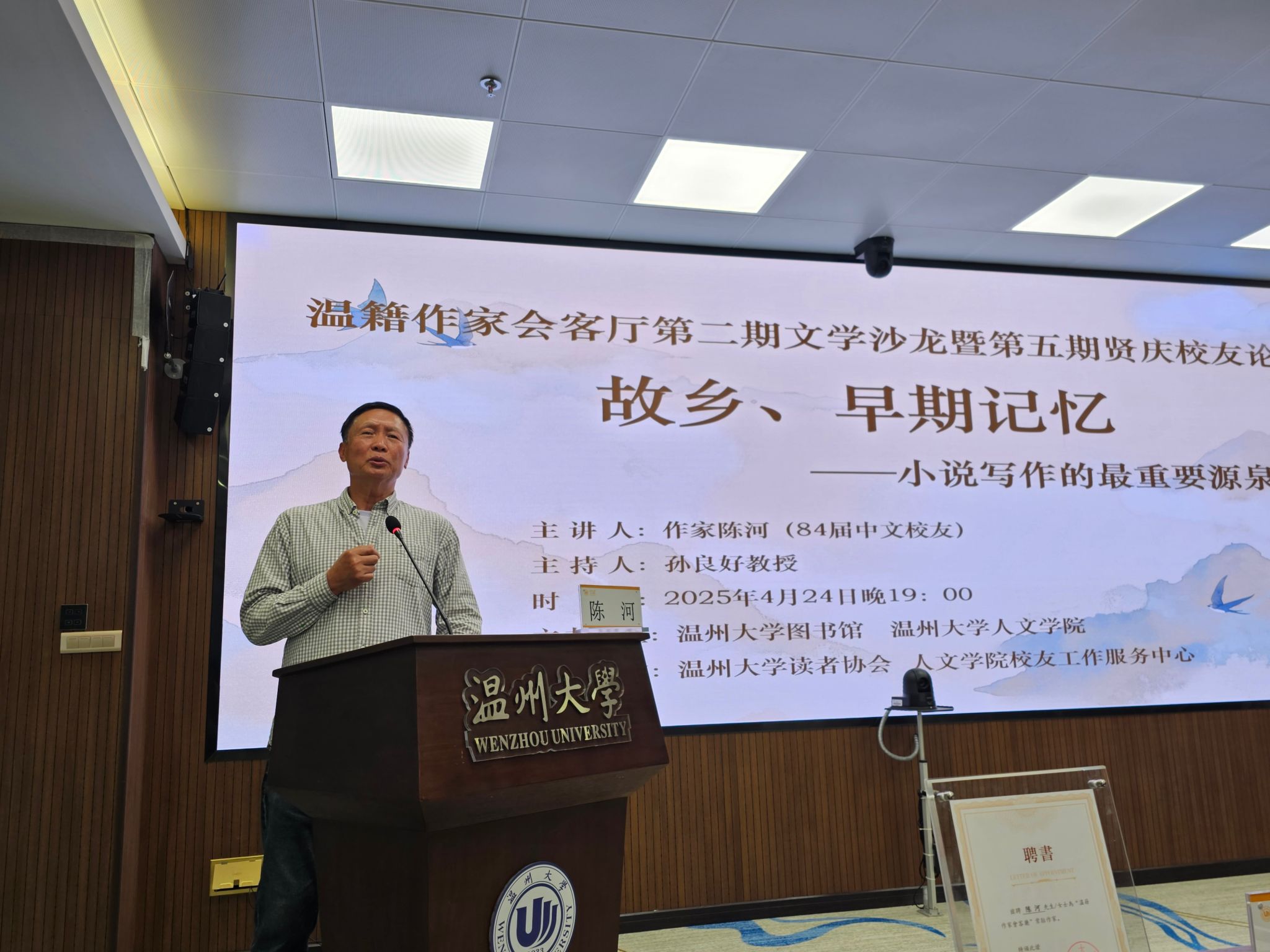 4月24日晚,1984届中文专业校友、知名作家陈河应邀重返母校,在育英图书馆A406会议室开展题为“故乡、早期记忆——小说写作的最重要源泉”的分享。本次活动由德赢ac米兰官方合作vwin图书馆馆长、德赢ac米兰官方合作vwin院长孙良好教授主持,师生代表60余人参与。